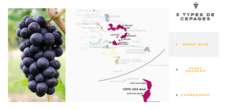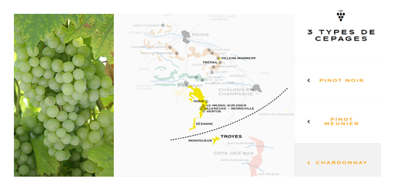 The characteristics of the terroir have led to the selection of the grape varieties that are best adapted to the natural conditions. Today, Pinot Noir (red grape), Meunier (red grape) and Chardonnay (white grape) are the main varieties. Arbanne, Petit Meslier, Pinot Blanc and Pinot Gris (all white grape varieties) are also permitted and make up less than 0.3% of the vineyard area.