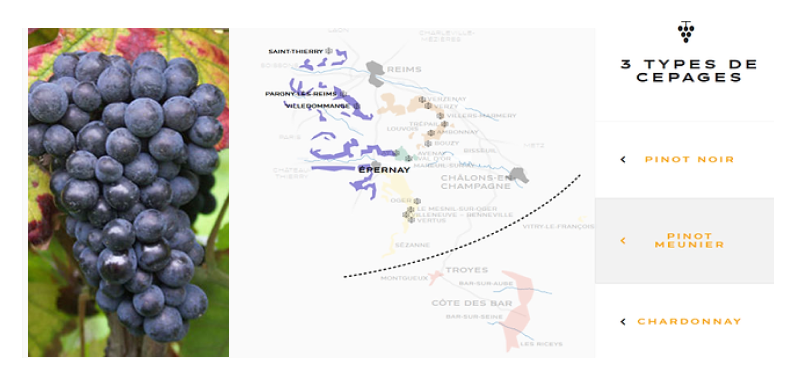 38% of the planted vineyard area in the Montagne de Reims and on the Côte des Bar. Pinot Noir gives the blend strength and volume. It gives a white juice because the skins do not have time to color the juice during pressing, producing a well-structured wine with a fine bouquet.